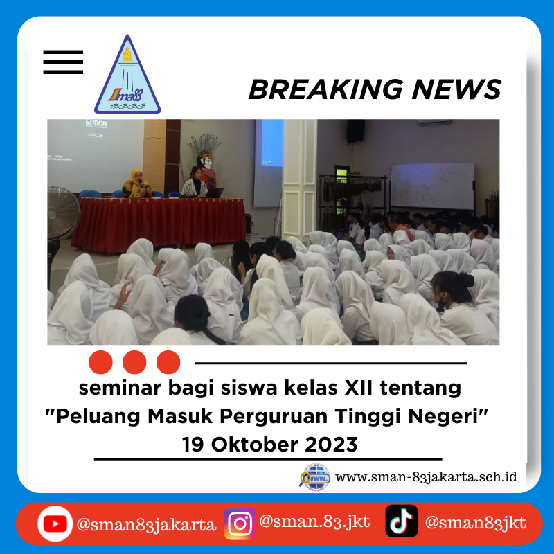 Jakarta, 19 Oktober 2023 - Dalam upaya memberikan panduan dan wawasan kepada siswa kelas XII mengenai proses pendaftaran dan peluang masuk perguruan tinggi negeri, sekolah SMA N 83 Jakarta menggelar seminar yang berjudul "Peluang Masuk Perguruan Tinggi Negeri." Seminar ini diselenggarakan pada hari Kamis, 19 Oktober 2023, pukul 10.00 hingga selesai, di Ruang Avis.